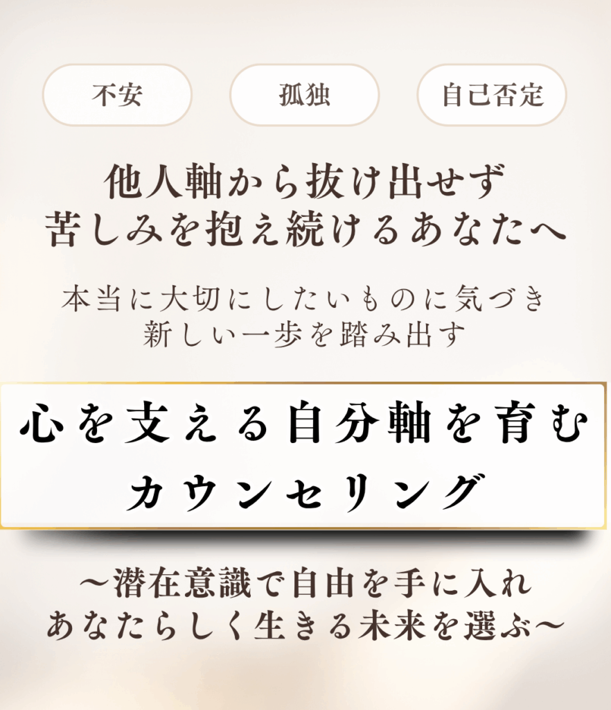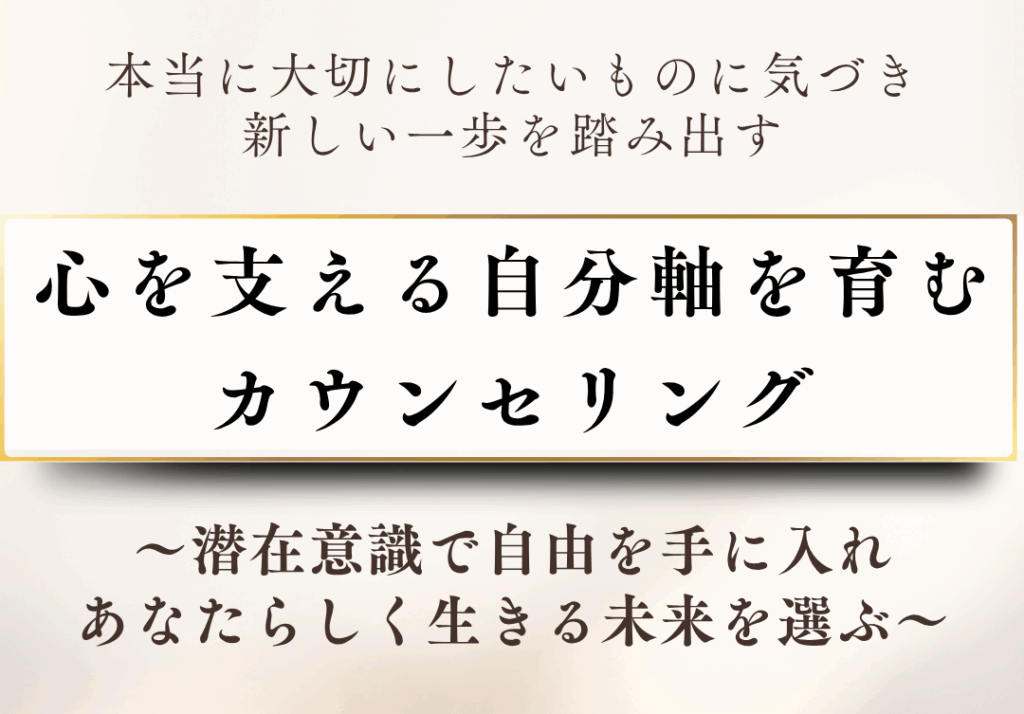 「心を支える自分軸を育むカウンセリング」では、潜在意識を活用して、あなたが本当に大切にしたいものに気付き、ありのままの自分を認められ、『自分軸』で新しい一歩を踏み出すことができるようになります。