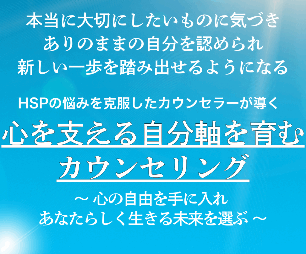 アダルトチルドレン・HSPの苦しさを経験し、乗り越えたカウンセラーが、あなたに寄り添い、自分らしい未来へ向かう一歩を踏み出すお手伝いをします。