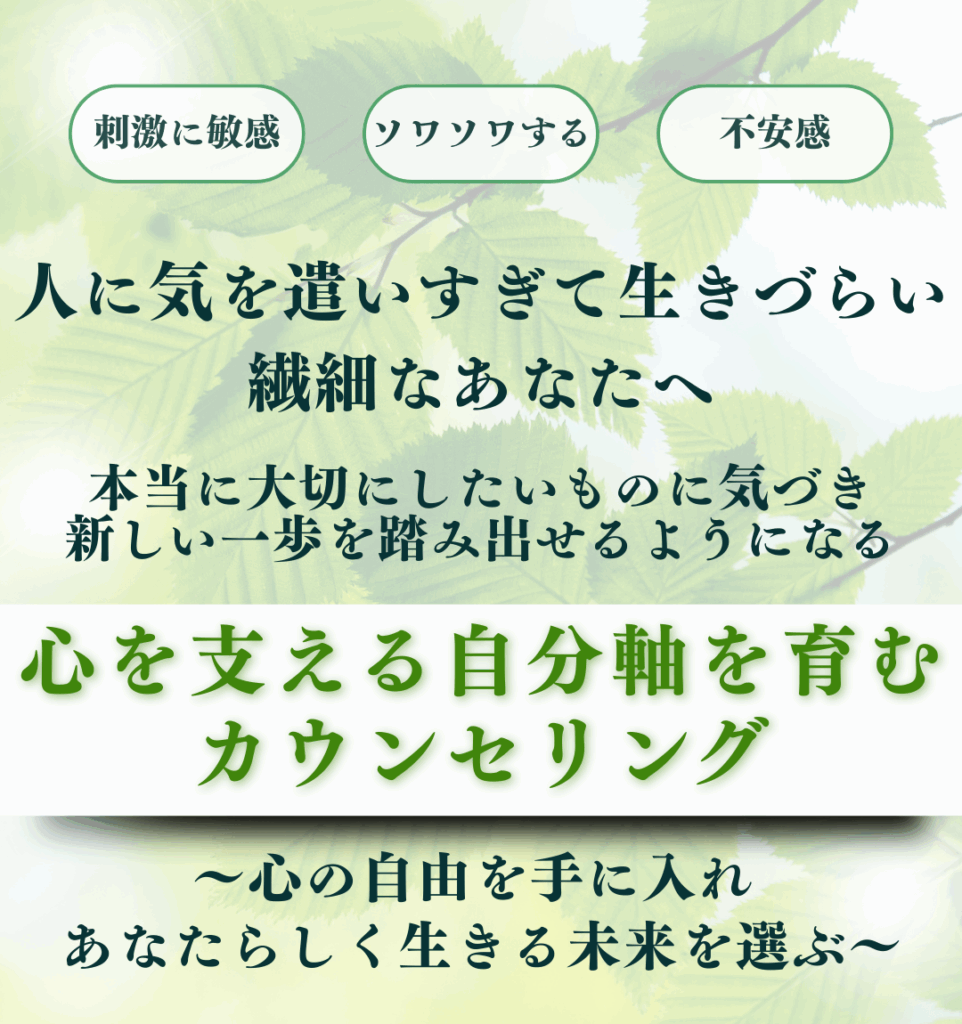 HSP・アダルトチルドレンの苦しさを知り、乗り越えた専門カウンセラーが、あなたに寄り添い、あなたらしい未来への一歩を踏みだすお手伝いをします。