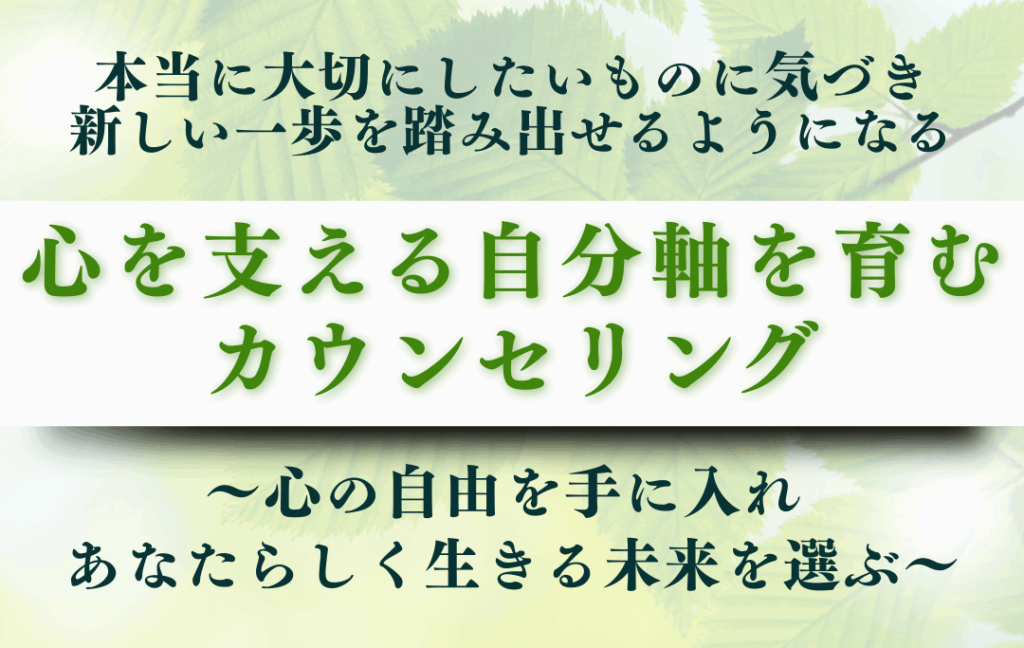 「心を支える自分軸を育むカウンセリング」では、潜在意識を活用して、あなたが本当に大切にしたいものに気付き、ありのままの自分を認められ、『自分軸』であなただけの新しい一歩を踏み出すことができるようになります。